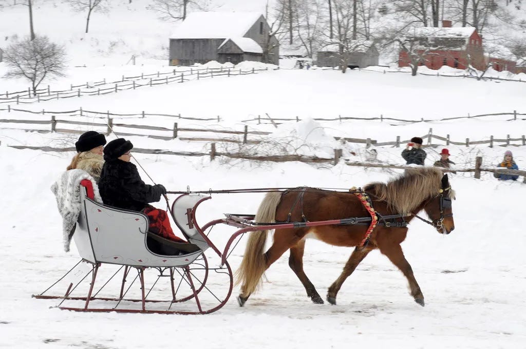 Back when sleigh rides were everyday winter travel, they were also social events. People held sleigh parties. Groups bundled up, hitched the horses, rang through the countryside, and ended the night with food, music, and long conversations once the horses were settled. The bells were the sound of a night out.